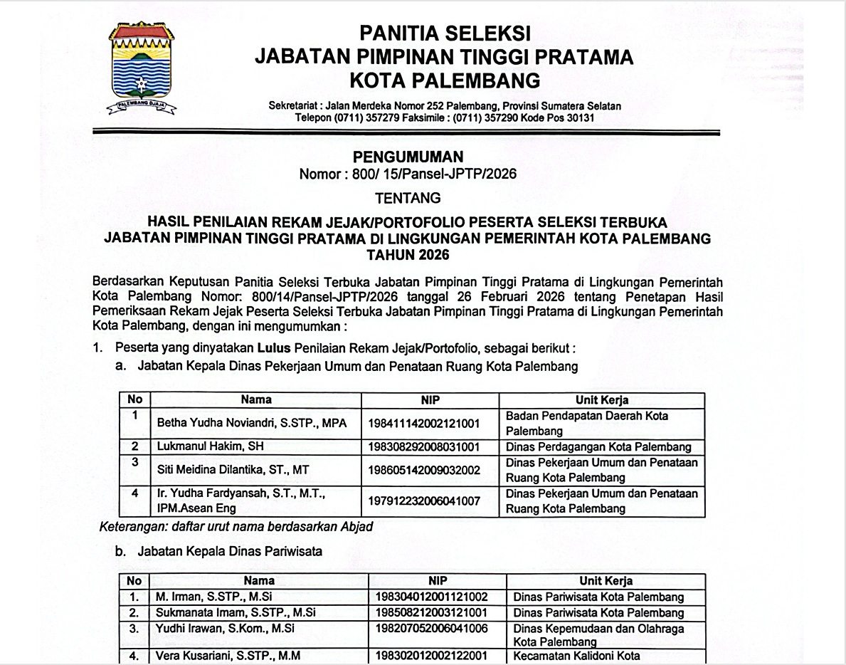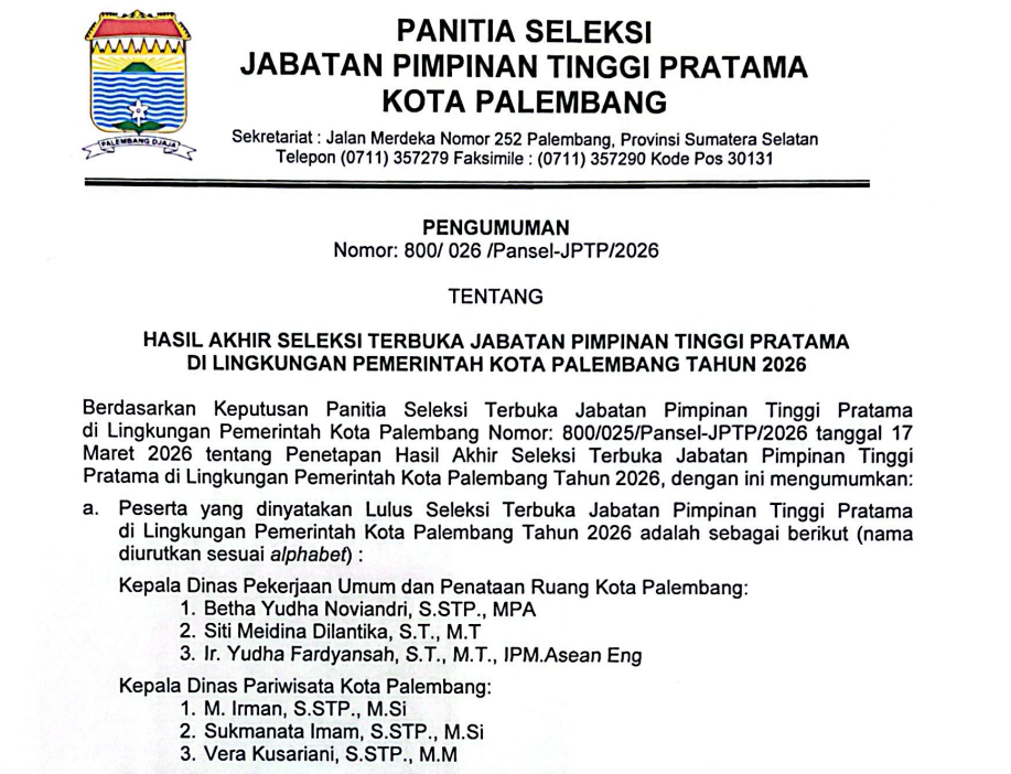 ..... Continous ReadingPENGUMUMAN HASIL AKHIR SELEKSI TERBUKA JPTP DI LINGKUNGAN PEMERINTAH KOTA PALEMB.....